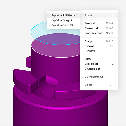Upload to Artec Studio to precisely position and fit your scans with CAD primitives, then export to SOLIDWORKS or other CAD software – or for inspection, directly to Control X for in-depth reports.